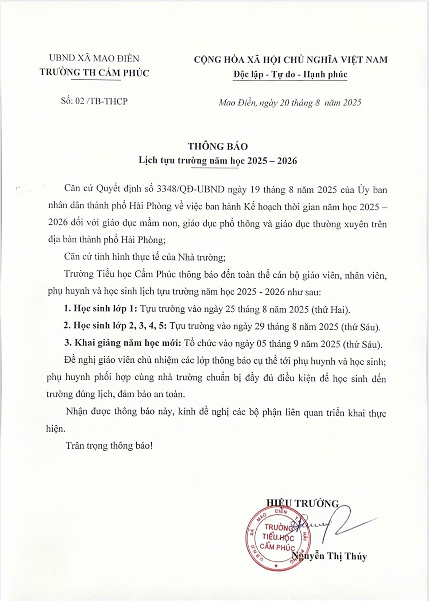 TRƯỜNG TH CẨM PHÚC THÔNG BÁO LỊCH TỰU TRƯỜNG NĂM HỌC 2025-2026
